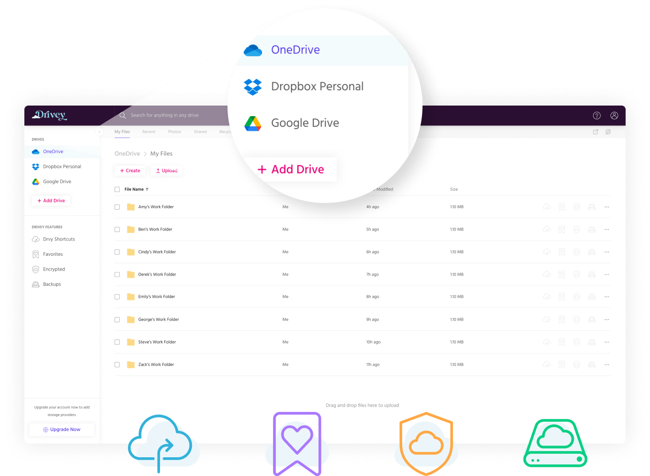 Drivey's search allows you to search across any attached drive from Google Drive, OneDrive, Dropbox personal, or Dropbox business. Advanced filters help you to find the files you need faster.